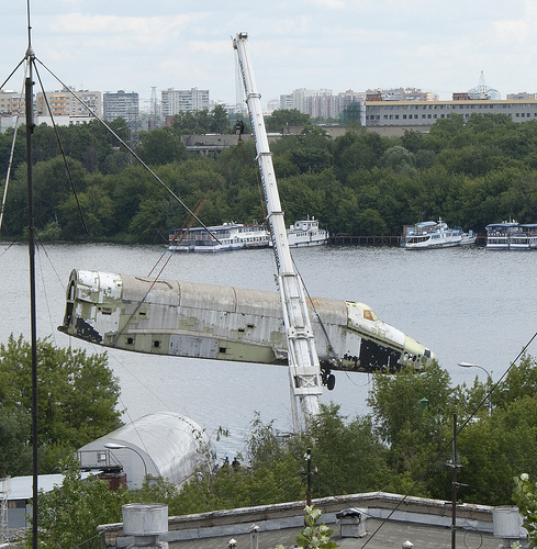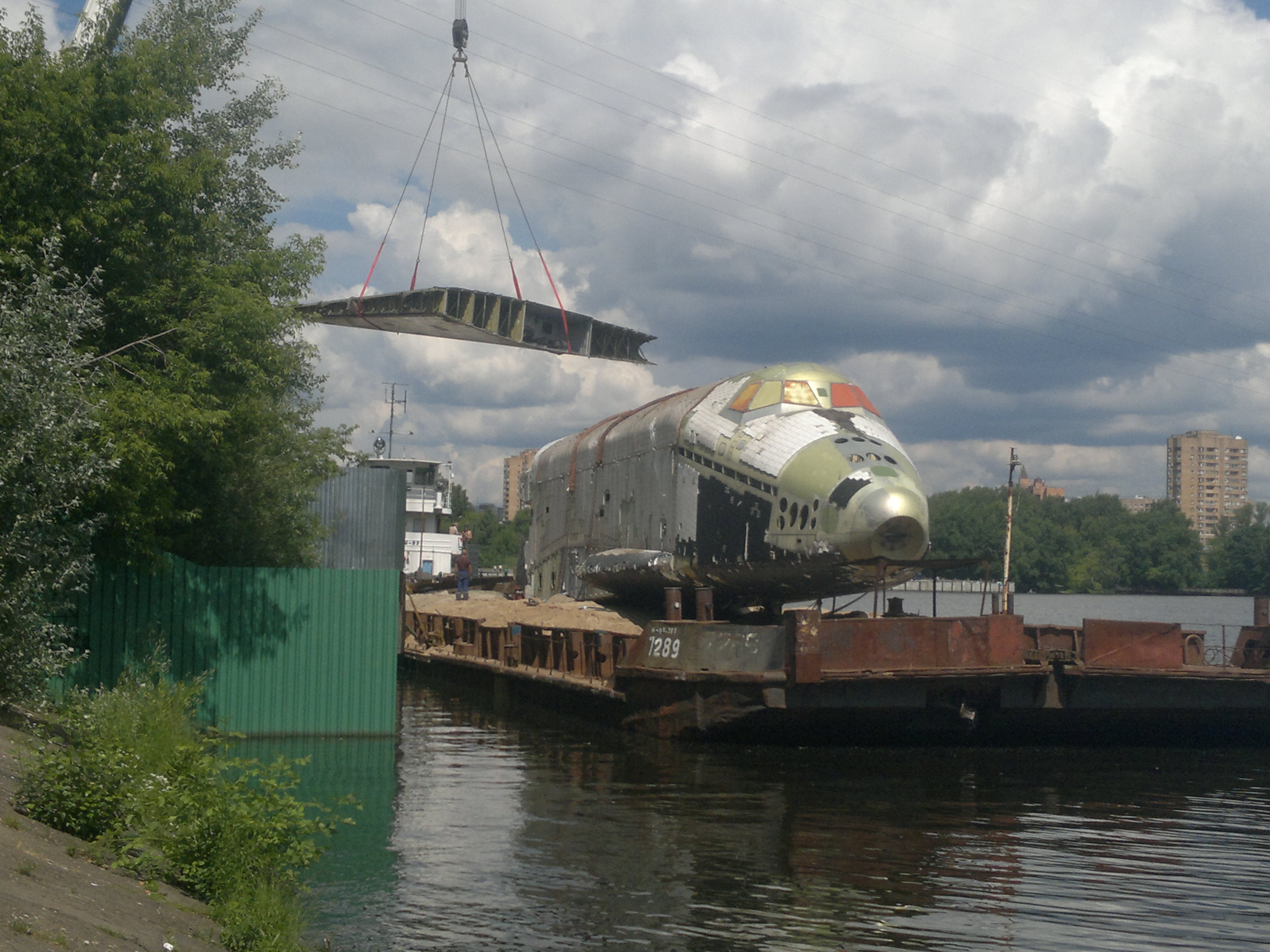 Pictures of the OK-2.01 shuttle at Tushino. The shuttle is loaded on a lighter to be transported to the Zhukosvky airbase where it will be restaured for the MAKS 2013.
