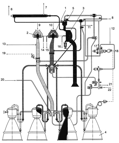 1-Frame; 2-Gases's duct; 3-Turbine's outflow collector; 4-Turbine; 5-Heat exchanger; 6-Oxidizer pump; 7-Actuators of the oxidizer's turbopump; 8-Fuel pump of the first level; 9-Fuel pump of the second level; 10,11-Second and first combustion chambers; 12-Outlet; 13-Starter; 14-Actuator of the rudder; 15-Flexible elements; 16-Actuator of the fuel's turbopump; 17-Crosspiece; 18-Separation valve